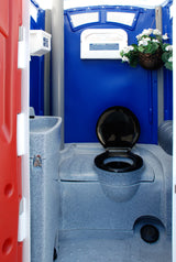 The CELEBRATION TOILET is a VIP special event portable toilet for rent that depicts American pride for any social gathering. This is a full service outdoor porta potty available exclusively through CALLAHEAD. Designed with the American flag's colors of red, white and blue, will bring a patriotic touch to sporting events, barbeques, house parties, graduation parties, fund raisers, weddings, corporate gatherings, community events or just about any special event in need of outdoor restroom facilities.